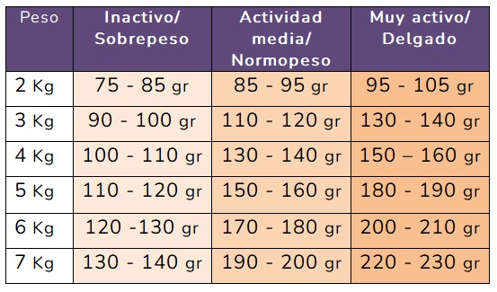 Tabla orientativa de ración diaria (en gramos) para gato adulto: