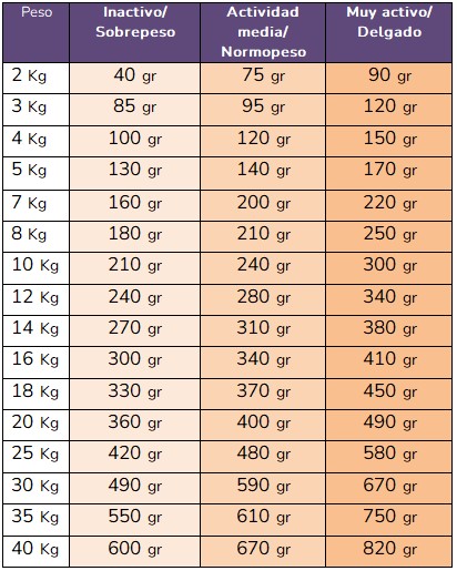 Tabla orientativa de ración diaria (en gramos) para perros adultos: