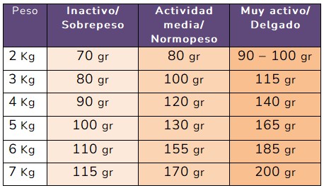 Tabla orientativa de ración diaria (en gramos) para gato adulto: