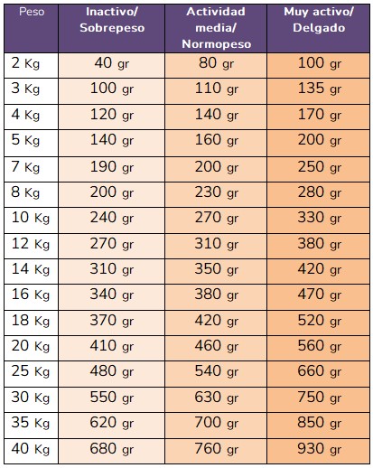 Tabla orientativa de ración diaria (en gramos) para perros adultos: