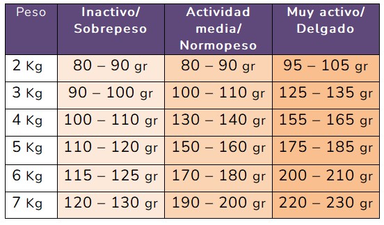 Tabla orientativa de ración diaria (en gramos):