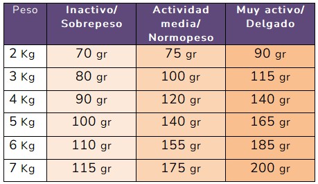 Tabla orientativa de ración diaria (en gramos) para gato adulto: